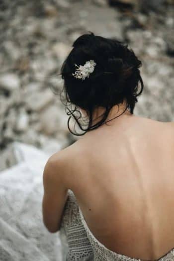 – Composition: gold-plated coral branches, freshwater pearls, gypsophila and hydrangea stabilized, golden metal comb
